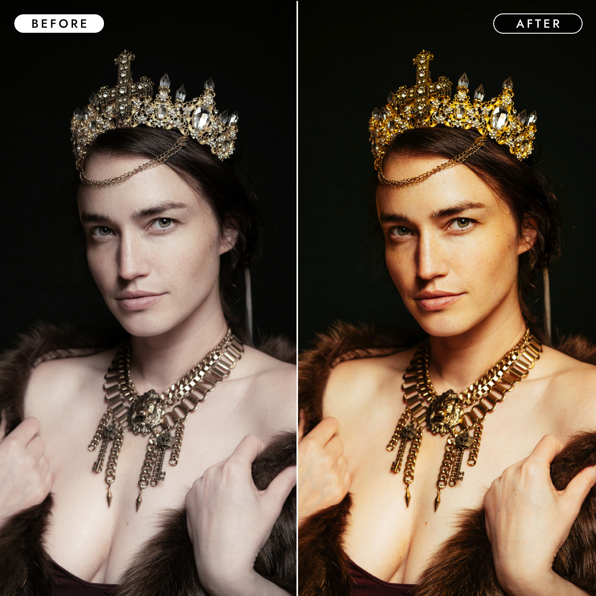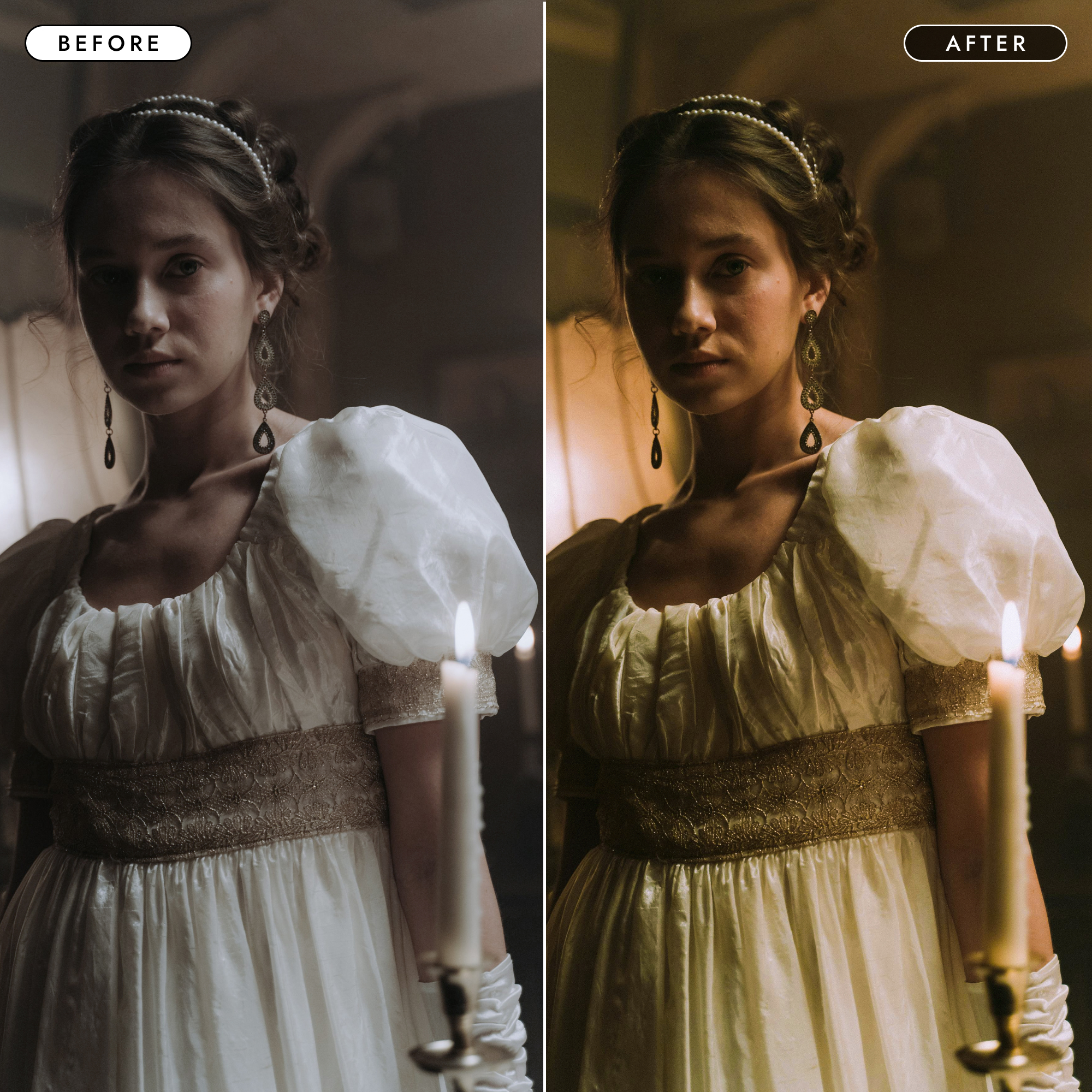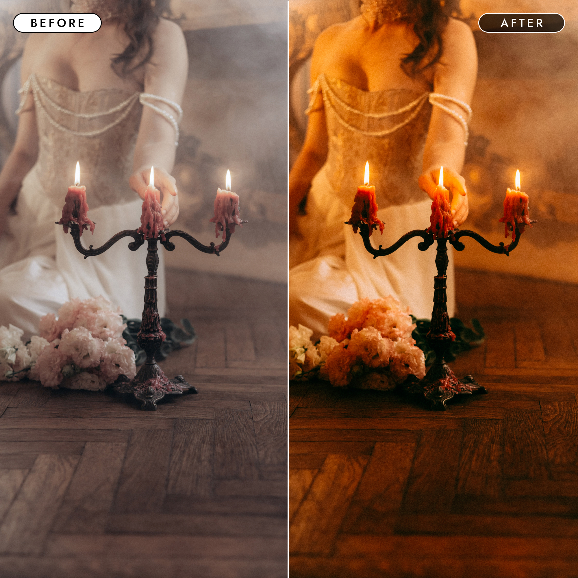 Baroque Mood Lightroom Presets are designed to capture the opulent drama of classical Baroque art. With 15 professional presets, this pack transforms your images with rich gold tones, deep contrasting shadows, and luxurious lighting effects — perfect for creating museum-worthy portraits, wedding photography, and artistic content.