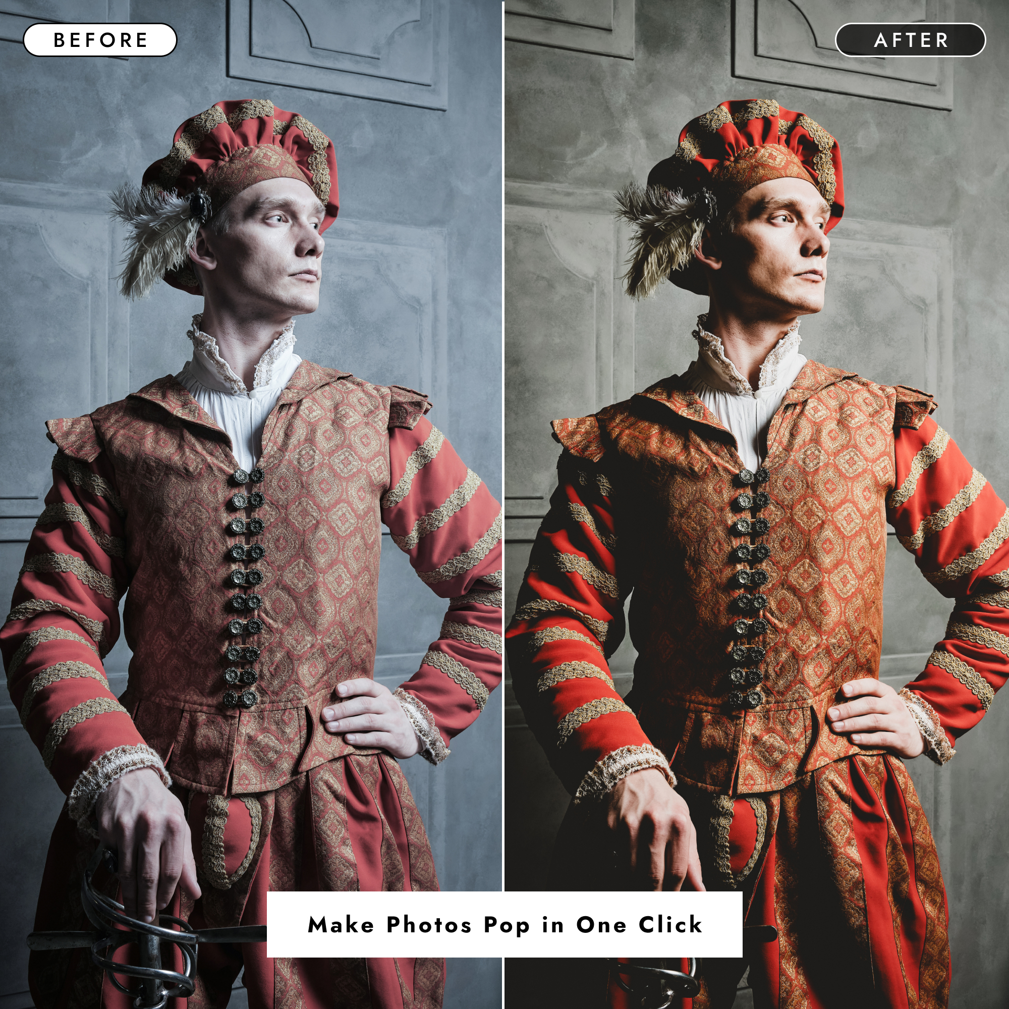 From dramatic chiaroscuro to gilded color palettes, these presets add depth and sophistication to every photo, creating a timeless Baroque aesthetic in just one click. Whether you’re a photographer, artist, or content creator, your images will instantly radiate the grandeur and emotion of classical masterpiece paintings.